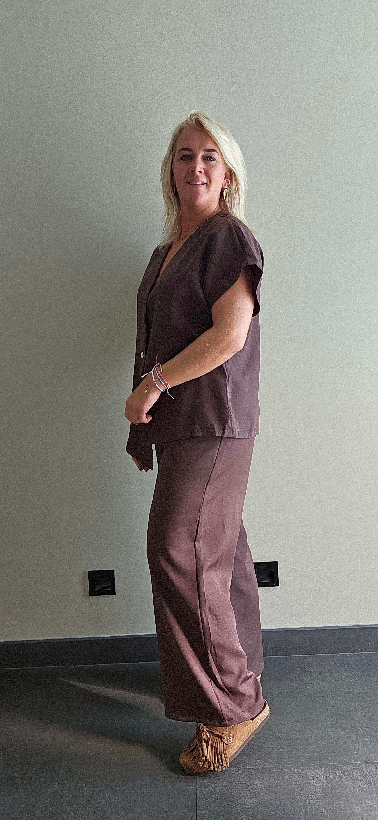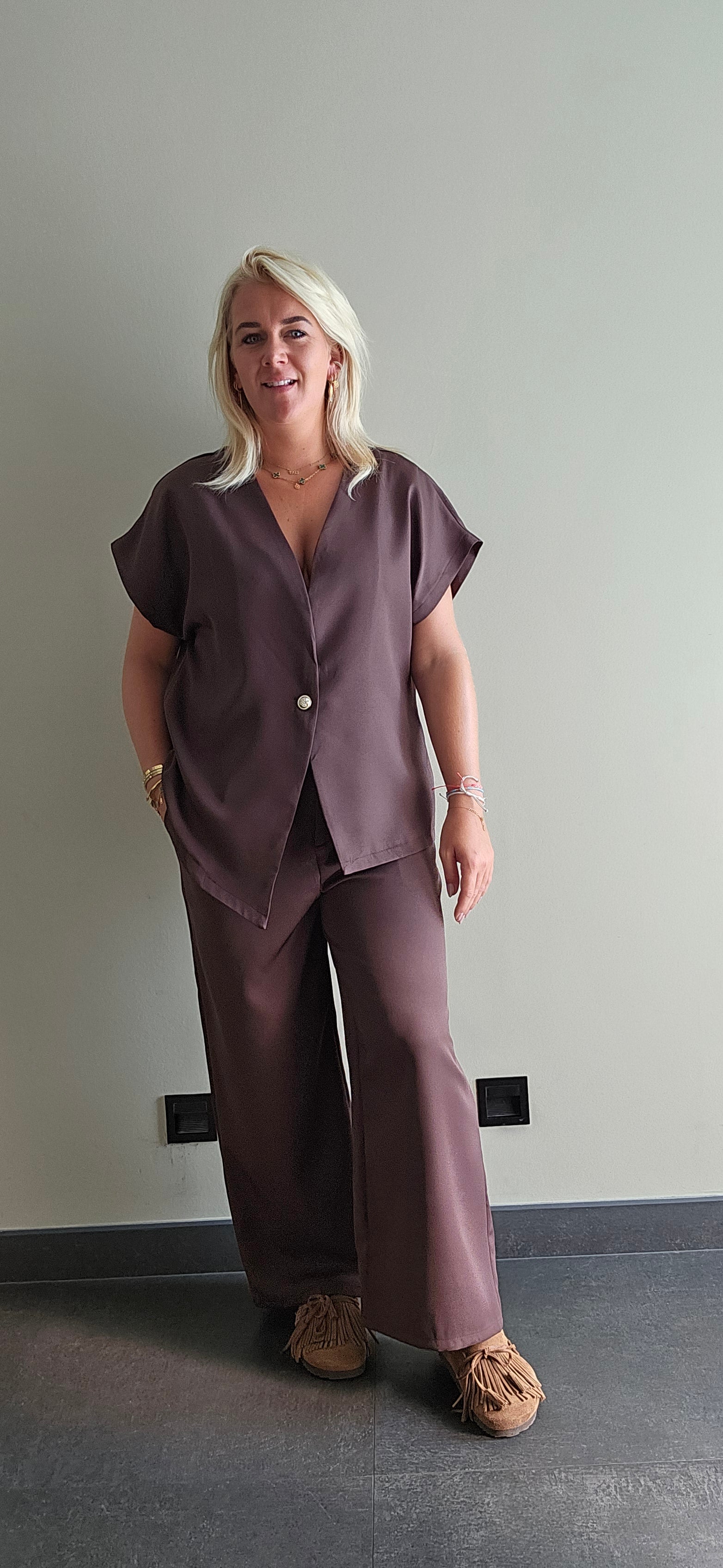 Chocolade bruin! Wauw dit is zo top pak. Een mooie pantalon broek met knoop en steekzakken. Het gilet kan je dicht dragen maar ook leuk open. Het gilet is asymmetrisch voor een speels effect.